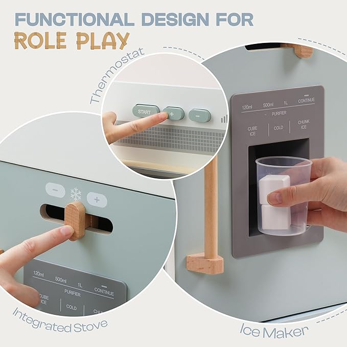 - 【REALISTIC KITCHEN PLAY SET】This wooden kitchen playset is designed for kids to have fun while imitating real cooking activities. It comes with a variety of kitchen accessories, including a stove, oven, sink, faucet, and refrigerator, allowing kids to role-play as chefs and cooks.