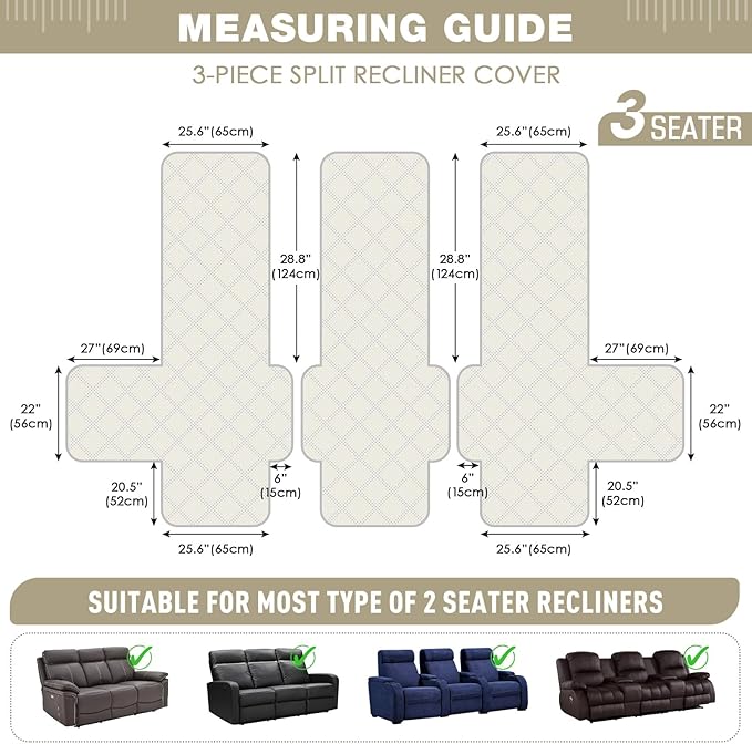 - 【3 SEATER RECLINING FIT】Our 3 seater sofa cover is designed to fit 3 seater reclining sofas, made with 3 seperate pieces , perfectly fit 76.8 inch reclining 3 seater couches. For more details, please refer to the measurement guide in the photo, please measure before purchase