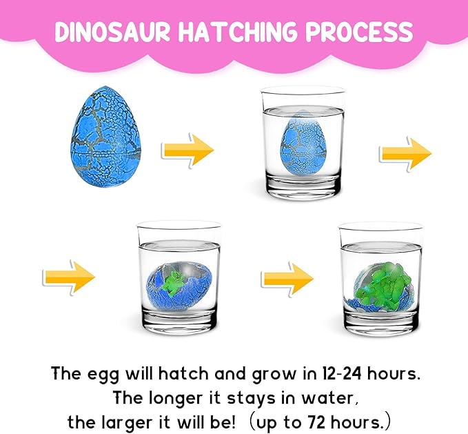- 【Magical Crack Dino Eggs】Size: 0.8" x 1.2"(2*3 cm), It's close to the size of a dollar coin. The magical crack dinosaur eggs, just place in cold water for 12-24 hours. It will hatch and grow into a small rubber dinosaur. The longer it's left in water, the larger it will grow! These colorful dinosaur eggs will meet kids' curiosity to teach children to understand the animal hatching process, they will be so excited to open this and see all the eggs!