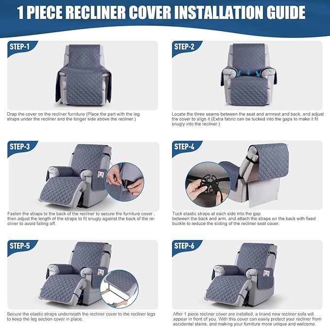 - TRIPLE STRAP DESIGN REDUCES MOVEMENT: This recliner chair slipcovers is designed with triple straps for the headrest, lumbar, and footrest of the recliner to keep it in place better, no need to worry about recliner cover slipping off; Reversible design keeps your recliner chair safe and reduces wear