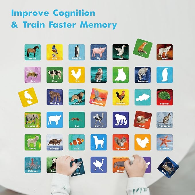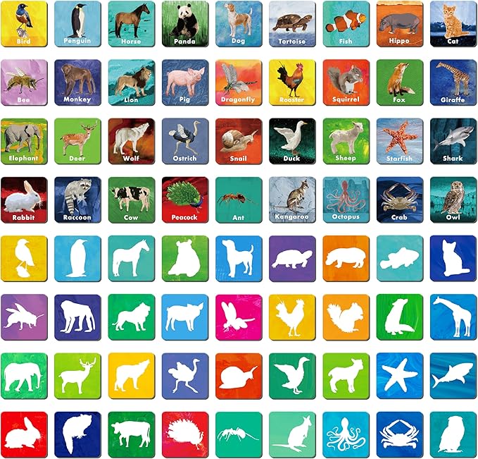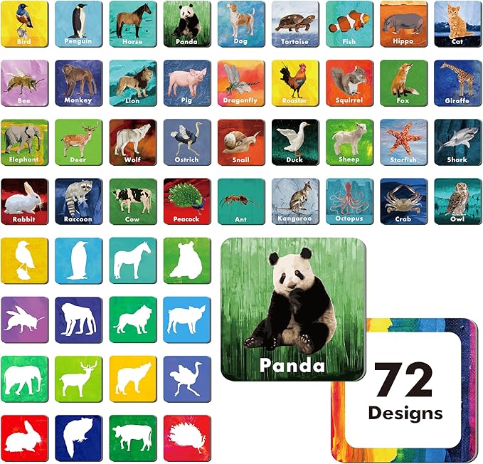 - 108 PCS Matching Cards: It comes with 72pcs animal cards and 36pcs corresponding animal shadow cards, helping kids get familiar with wonderful animal world. There are three play methods, you can match the same animal cards, or match the animal card with its shadow cards or draw pictures on the back and make a new game by your imagination. Each card measures 2” X 2”.