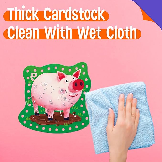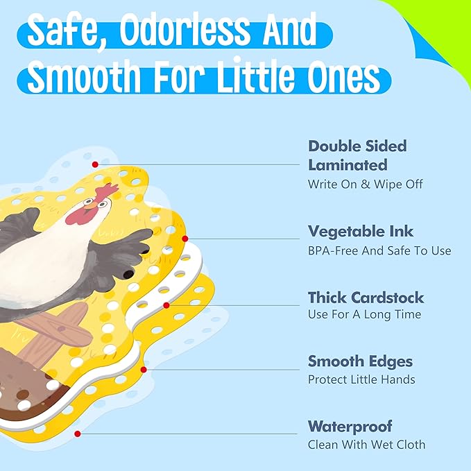 - Cute Patterns & Smart Designs: The pattern covers diverse farm animals, like cow, duck, rooster, hen, owl, sheep, monkey, frog and horse. The illustrations on cards are big, vivid and vibrant. The holes are clearly cut and easy for preschoolers to work with. The strings are easy for children to use and fit into the holes easily.