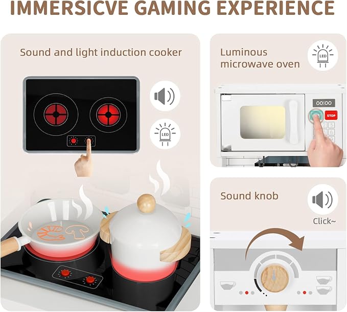 - All-round Versatile Play Center: Front- A fully equipped multi-functional kitchen with abundant adorable accessories as cooking utensils, chef hat and apron. Coffee maker, microwave oven, kitchen sink, oven, dishwasher, induction cooker and garbage classification box, plus with sim-life light and sound effect, all these makes it an interesting and ideal kitchen set for toddlers to explore and enjoy.