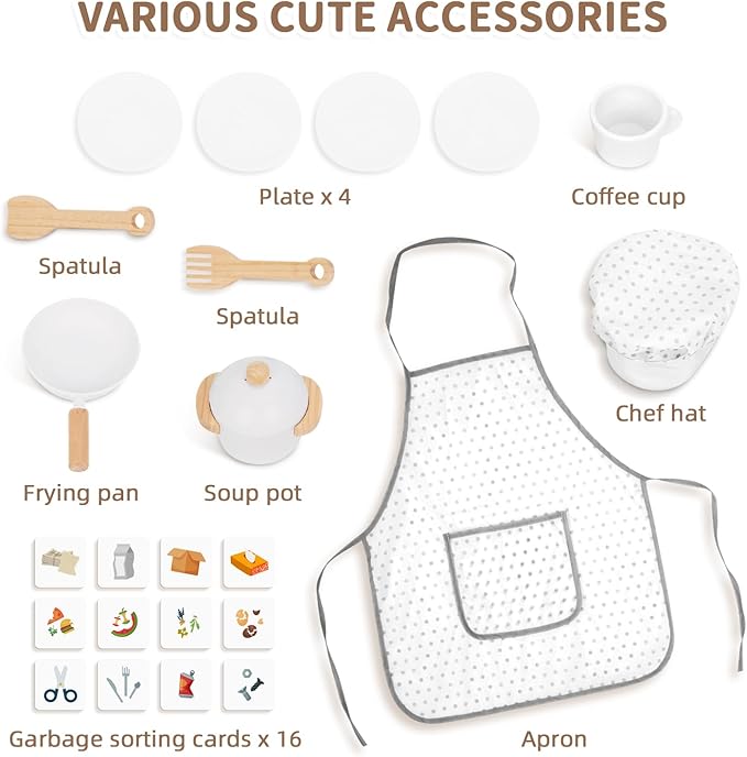 - Stable and Safe: The play kitchen for toddlers is made of high-quality wood, polished with smooth surface and rounded edges, makes it a safe partner to our beloved children during years of play.