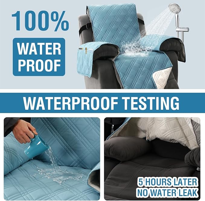 H.VERSAILTEX 100% Waterproof Small Recliner Chairs for Adults Lazy Boy Recliner Chair Covers Furniture Protector with Elastic Straps for Pets Kids Sitting Width Up to 23" (Recliner, Smoke Blue/Beige)