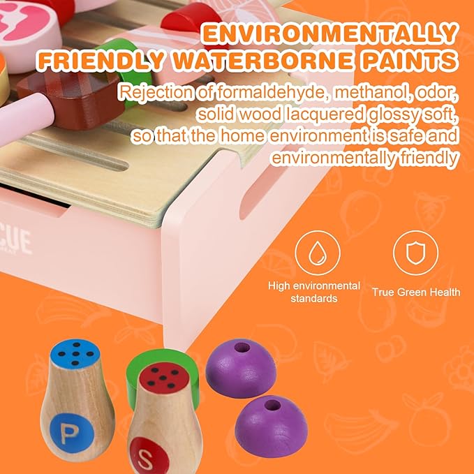 Wooden Grill Playset for Kids 3 Years Old,Children BBQ Grill Playset,2023 New Upgrade Play Kitchen Toy Grill-Pink