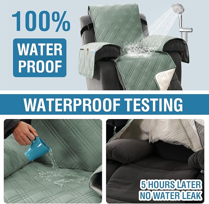 H.VERSAILTEX 100% Waterproof Couch Cover for Reclining Couch Reversible Recliner Covers for Large Recliner with Elastic Straps Sitting Width Up to 28" (Oversized Recliner, Lily Pad/Beige)