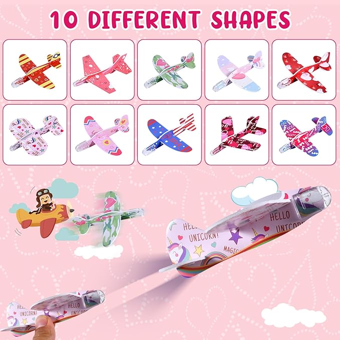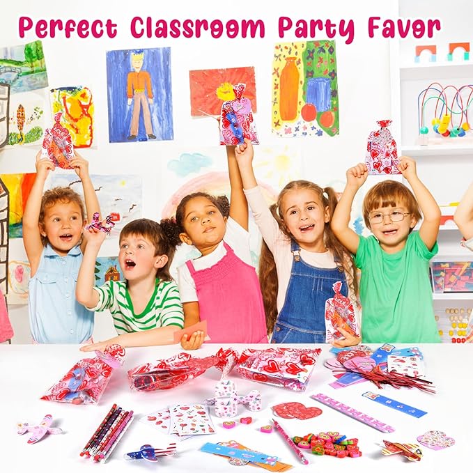 - 【Make Your Own Valentines Day Gifts】Writing text on the Valentine's Day card, and then put 1 card/1 pencil/1 eraser/1 foam airplane/1 sticker/1 slap bracelet/1 ruler into the Valentine's Day goodie bag, close the bag with the gold metal twist tie to create 28 party favor stationery bags. Perfet classroom exchange gifts to both girls and boys.Wonderful valentines day cards for kids school classroom.