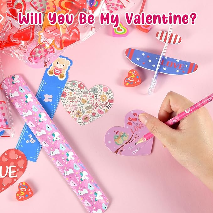 - 【Super Value Valentines Day Gifts for Kids】 this assorted stationery set contains 28 Valentines Day cards, 28 Valentine pencils, 28 Valentine’s heart erasers, 28 Valentine stickers, 28 Valentine foam airplanes, 28 Valentine rulers, 28 Valentine slap bracelets, 28 valentines goodie bags.A total of 224 pieces to meet kids’ need used for school classroom gift exchange party treats.