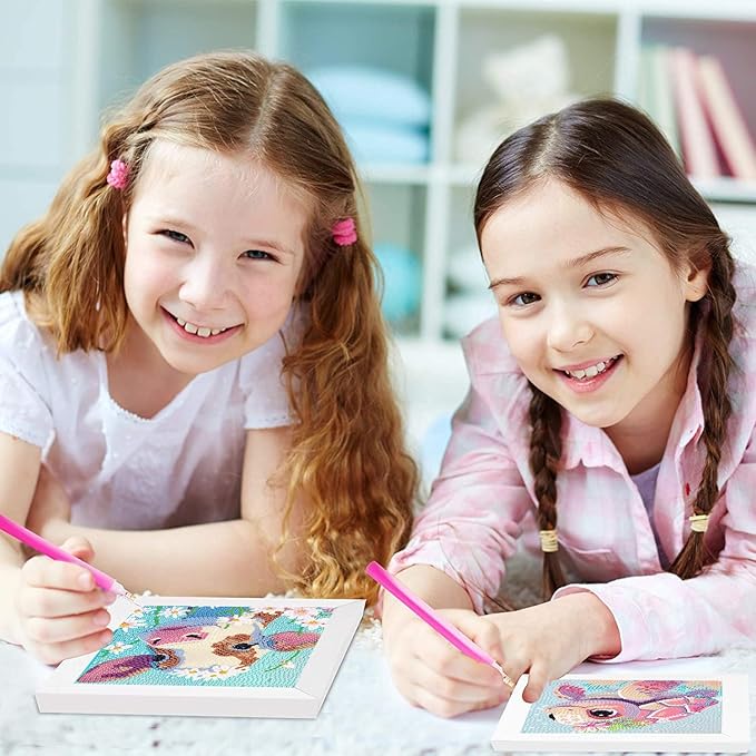 - Diamond Art Kits for Kids:This is a cartoon diamond art kit for kids and beginners,what is includes various colors of diamond dots ,4 tray,4 diamond pen,4 canvas and 4 diamond art glue.All of those tools are the necessary parts in your diamond arts and crafts work.