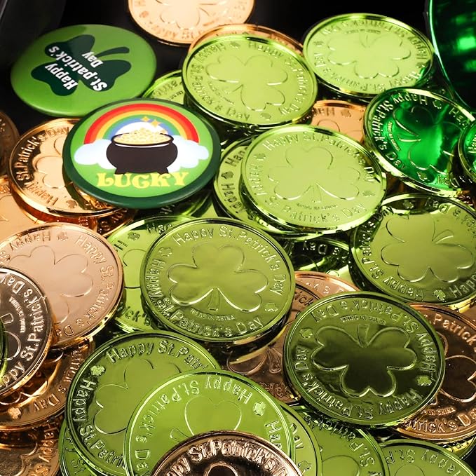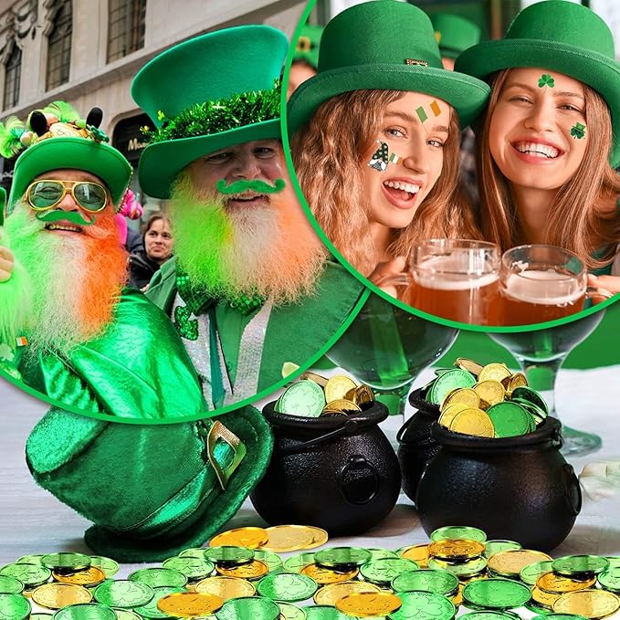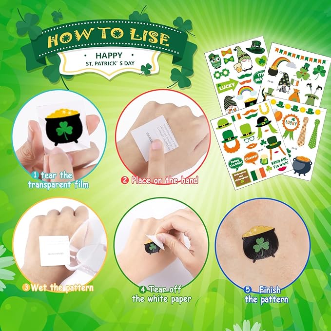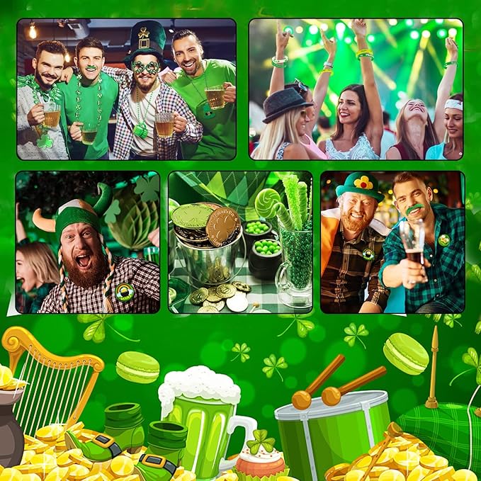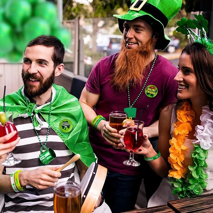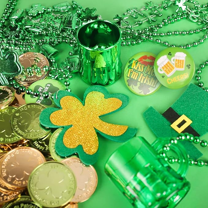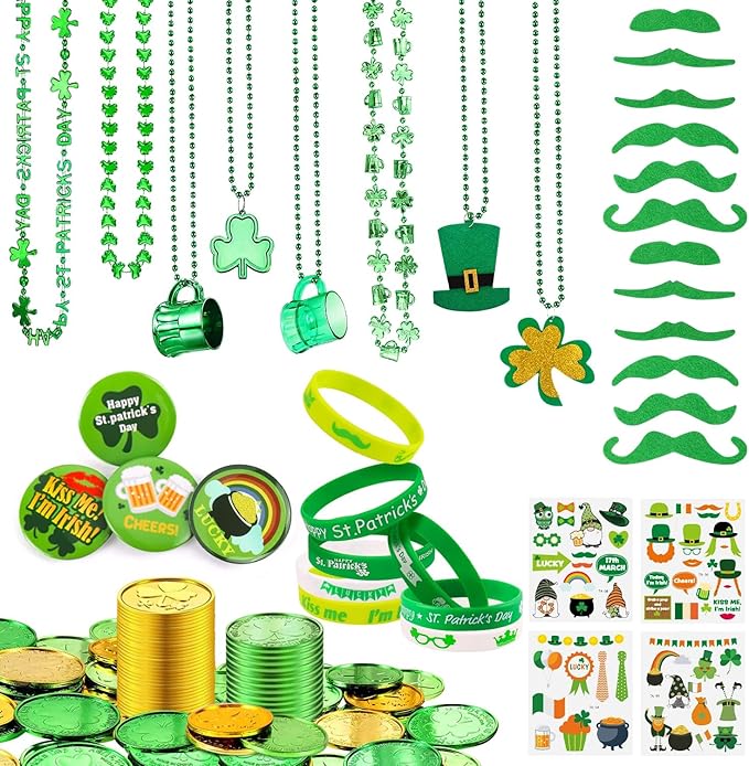 - 🍀【Valuable St. Patrick's Day Party Favor Set 】🍀Elevate your St. Patrick's Day celebration with our exquisite St. Patrick's Day accessories Set!! Includes 50 shamrock coins, 8 necklaces, 8 wristbands, 12 mustaches, 4 badges, and 4 tattoos sheets.This comprehensive assortment ensures your party guests look green and fabulous, creating an unforgettable experience.