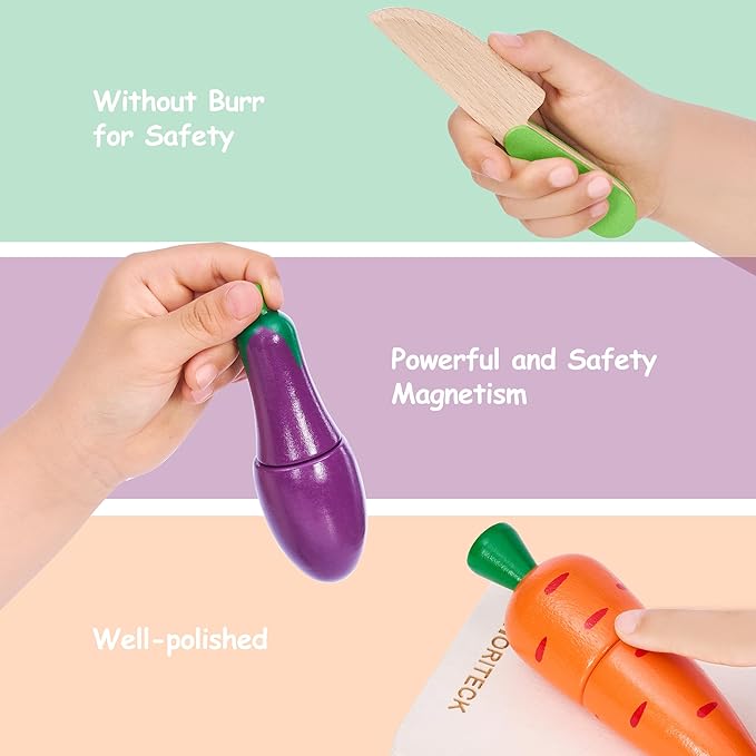 • DEVELOP HANDS-ON SKILLS- The series of movements of choosing, placing, and then cutting by knife can stimulate the development of motor neurons in children, promote hand eye coordination, and hands-on ability; the wooden fruits are connected by the strong magnetism, not easy to fall off and for multiple playing