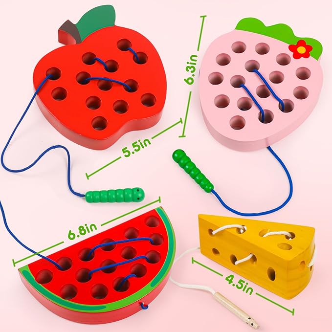 - Four Colorful Fruit Designs: Our lacing set features four charming wooden fruit shapes - an apple,a watermelon,a cheese, and a juicy strawberry. With vibrant colors and smooth surfaces, these toys are designed to captivate toddler attention and stimulate their imagination.