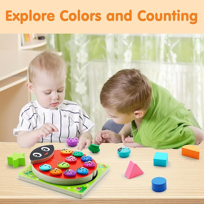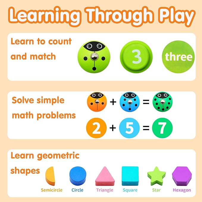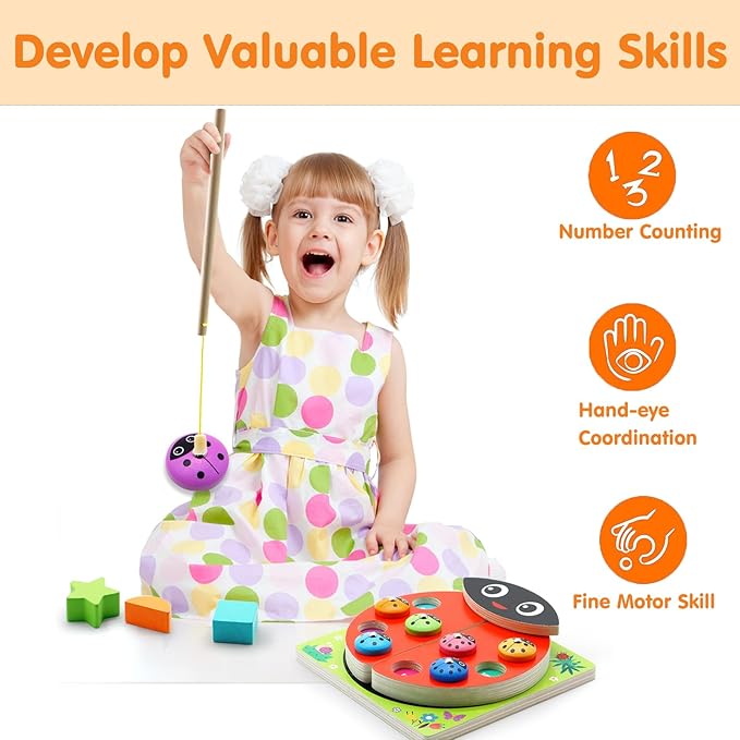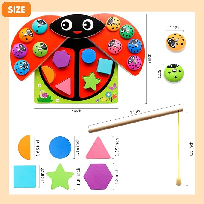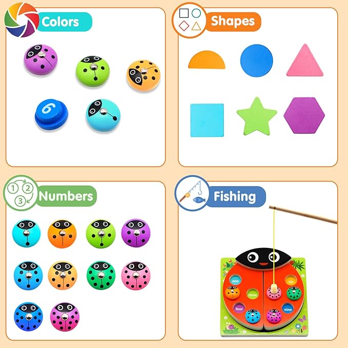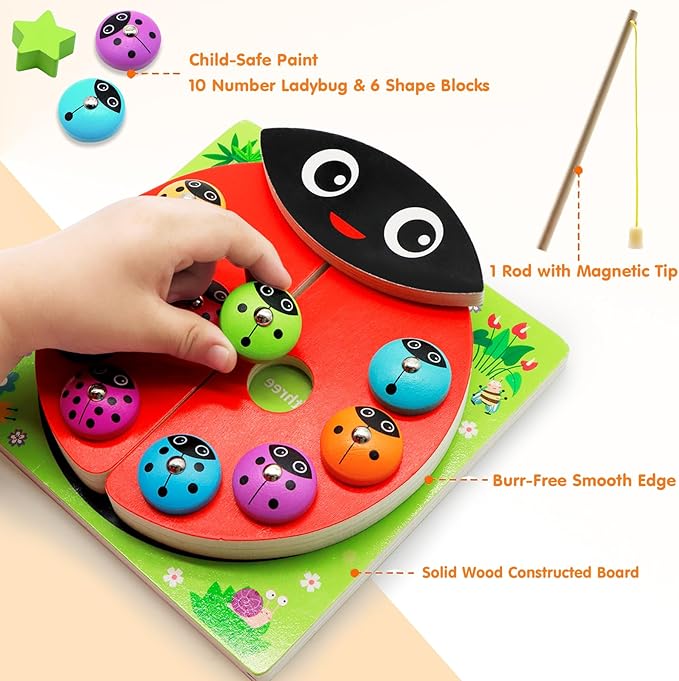- Learn with Ladybugs: Ignite joyful play with this ladybug board, allowing magnetic fishing, shape sorting, color matching, and number learning. Inspired by Montessori principles, these adorable ladybug toys help toddlers understand foundational math skills, including counting and number recognition.