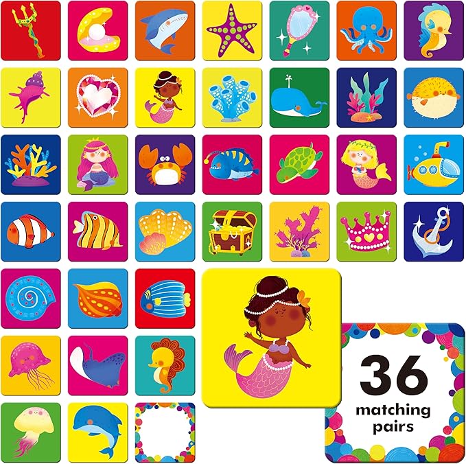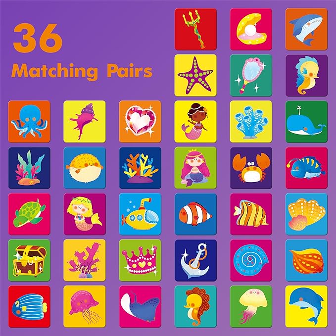 - Including 72pcs Matching Cards: Total 72 cards make it 36 pairs for kids to get familiar with mermaid world. It contains coral, submarine, mermaid princess, crown, gemstone, shell, etc. This provides an opportunity for children to get to know the colorful marine life, captivate underwater scenes and expand their knowledge of the world around them.