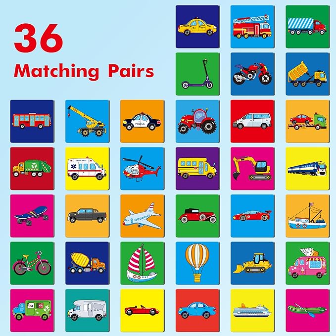 - Including 72pcs Matching Cards: Total 72 cards make it 36 pairs for kids to get familiar with vehicles. It contains police car, animal truck, airplane, boat, helicopter, train, etc. This provides an opportunity for children to learn about different modes of transportation and expand their knowledge of the world around them.