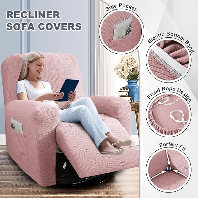 JIVINER Recliner Couch Cover, Jacquard 5 Piece Stretch Sofa Covers for 3 Cushion Reclining Lazy Boy Soft Washable Sofa Slipcovers Protector with Pockets (Recliner Sofa, Dusty Pink)