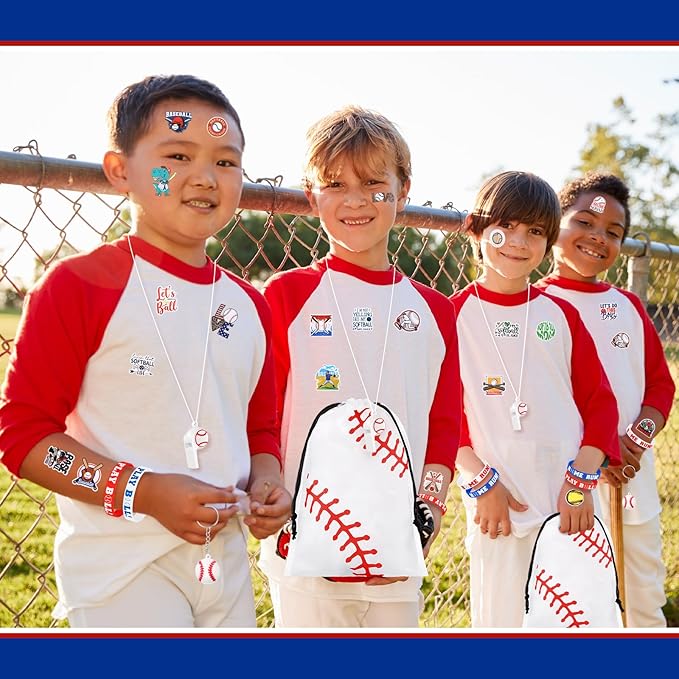 - Package Includes: 24 pcs of baseball silicone bracelets, 24 pcs of baseball charm bracelets, 24 pcs of pull back car, 24 pcs of baseball keychains, 24 pcs of baseball non woven drawstring bags, 50 sheet of baseball stickers, and 24 pcs of baseball whistles, the thoughtful set will save much of your energy and time