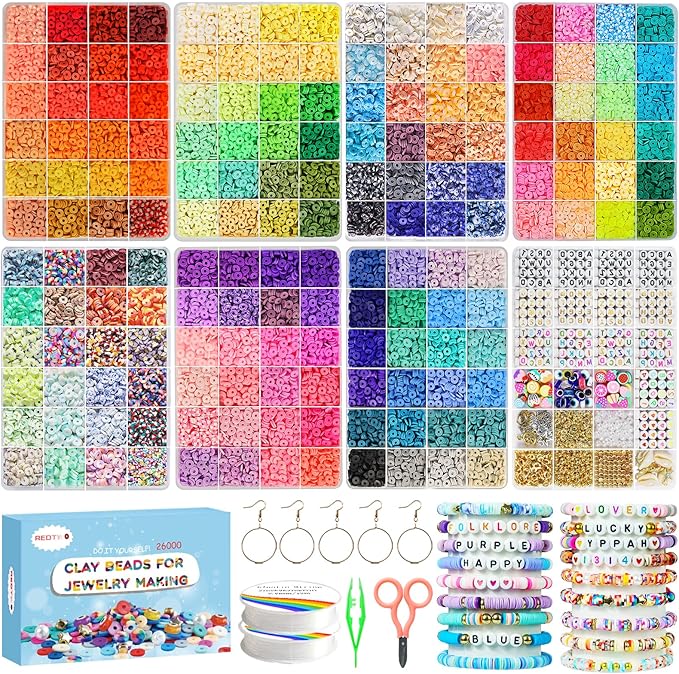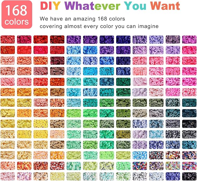 - All Inclusive: Redtwo clay beads bracelet making kit contains about 24910 flat clay beads in 168 colors; and comes with about 1090 kinds of accessories and tools, such as letter beads from A to Z, number beads, smile beads, bag clasps, lobster clasps and other charms, as well as 2 rolls of elastic cord, scissors, tweezers, and other tools; it can satisfy all the needs of DIY bracelets or jewelry; it is the best choice for the jewelry making enthusiasts