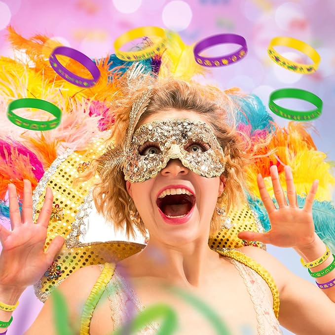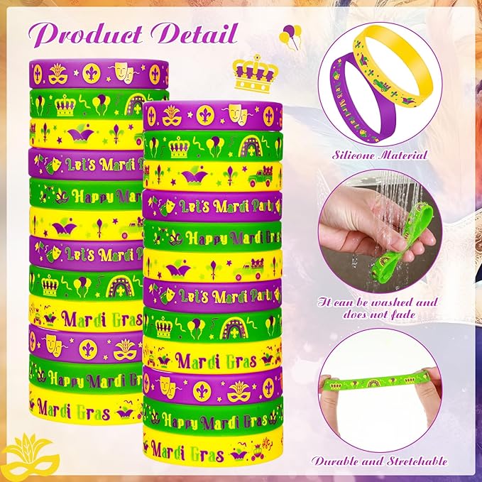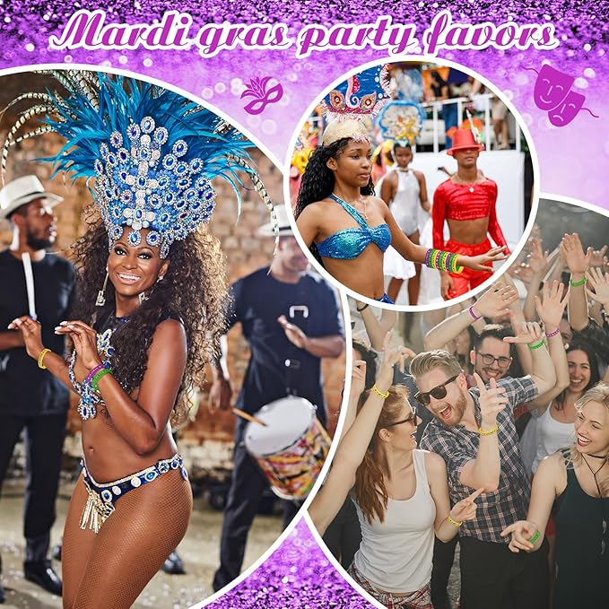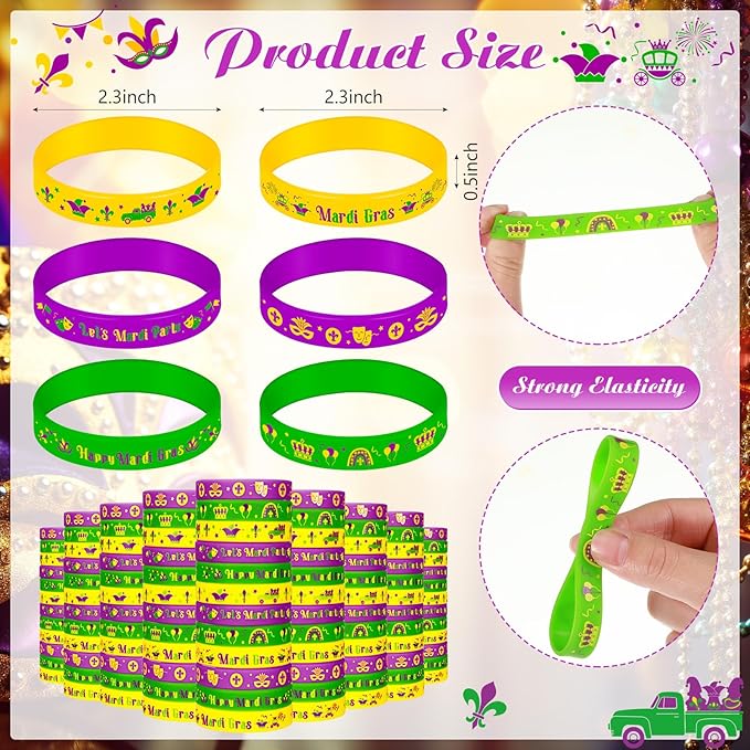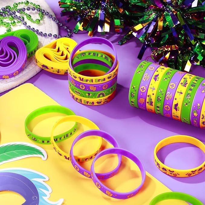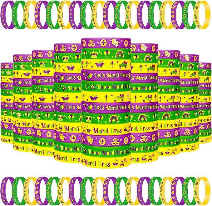 Wettarn 100 Pcs Mardi Gras Silicone Bracelets Mardi Gras Rubber Bracelets Mardi Gras Carnival Bracelet Set Mardi Gras Party Favors for Goodie Bag Favor Stuffers Birthday Party Favors Supplies