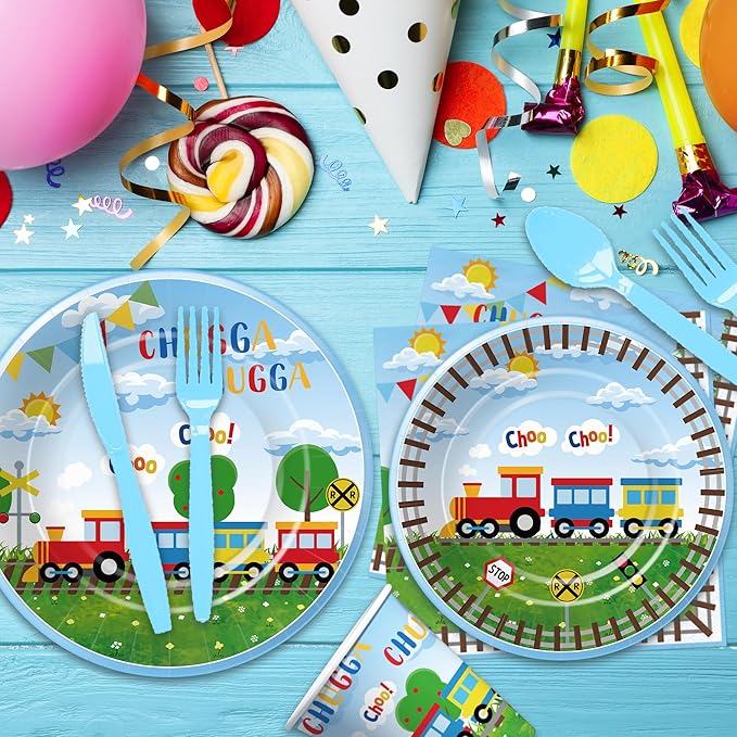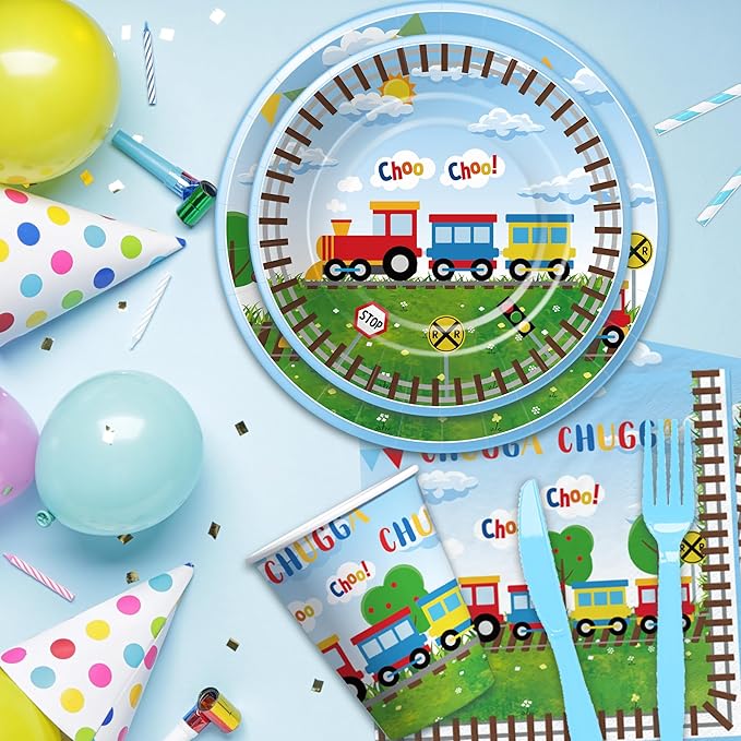- 【Train Table Decorations】Celebrate in style with our train party tableware! Our dinnerware set showcases a colorful train design with vibrant blue, green, and red accents, making it perfect for little ones who adore trains. It adds a playful touch to your party and guarantees a fun-filled celebration