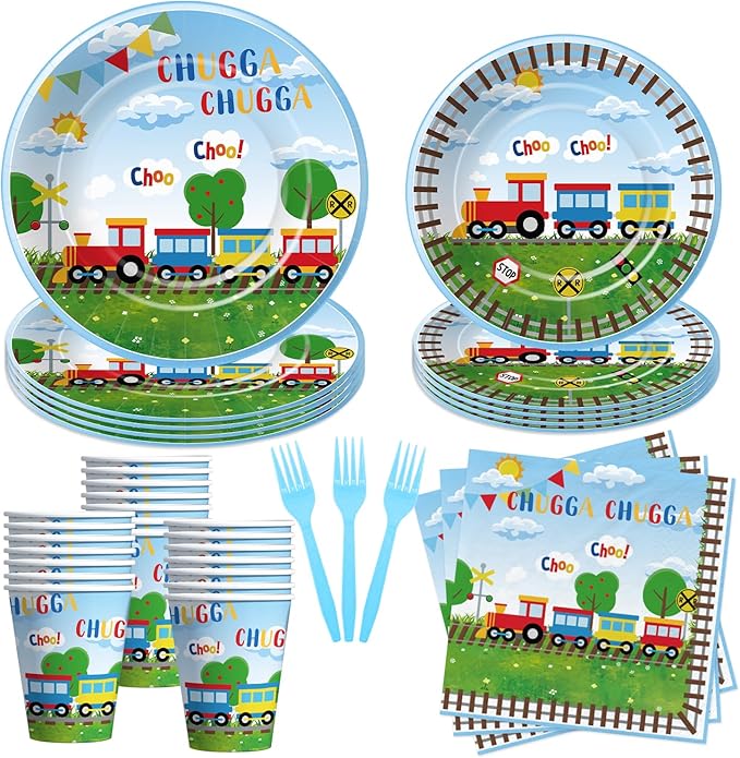 Train Birthday Plates And Napkins Party Supplies Dinnerware, Train Birthday Decorations, Plate, Cup, Napkin, Fork, Train Theme Chugga Choo Party Supplies For 1st 2nd 3rd Birthday | 24 Guests