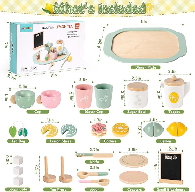 - FRESH COLOR: We carefully use solid wood materials, smooth and round edges, durable products, do not hurt hands. The tea set is designed to fit into the palm of a child's hand. In addition, we have designed a small blackboard so that the children can run their own lemon tea stall. In addition, our products use fresh and clean color scheme, when not in use can also be used as a decorative object in the home. Our products are fun and decorative in one, just to give you a better experience