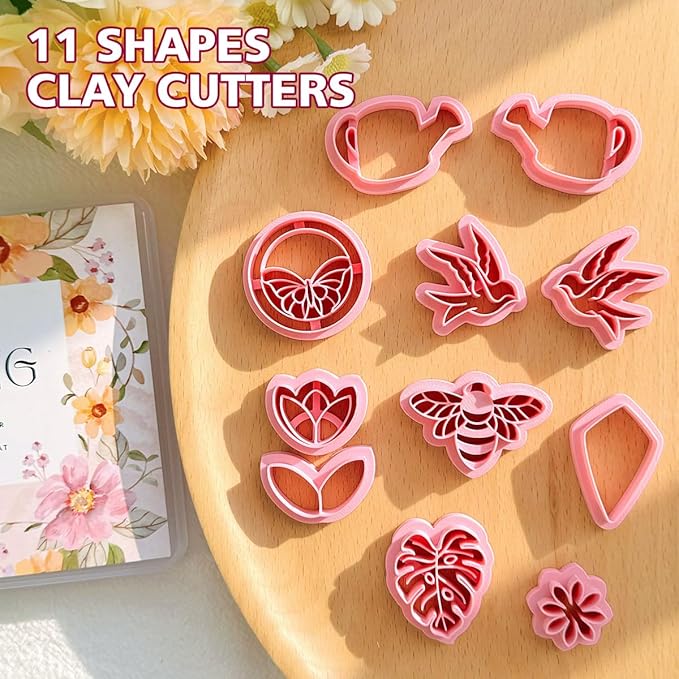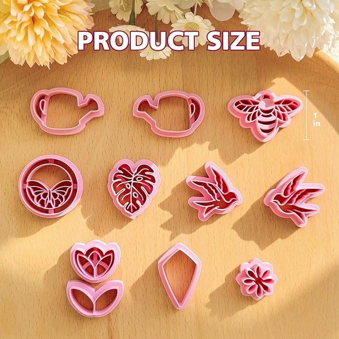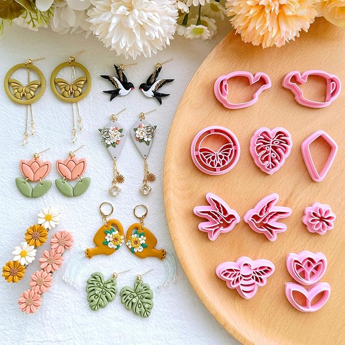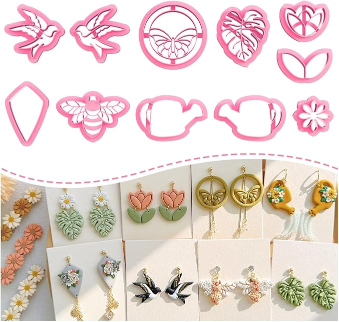- 【 Spring Clay Earring Cutters】11 polymer clay cutters spring: flower clay cutter, bee clay cutters, swallow polymer clay cutters, kite clay earrings cutter, monstera leaves clay cutter, watering can clay cutters, butterfly clay cutter.