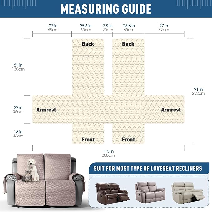 - 【Four-Tier Anti-Slip Promise】Tired of your love seat couch covers slipping all over? Discover our Fourfold Anti-Slip Innovation! 1. Backed by anti-slip silicone particles; 2. Three elastic straps for the headrest, lumbar, and footrest of the recliner - no more worries about your large recliner cover taking a stroll!