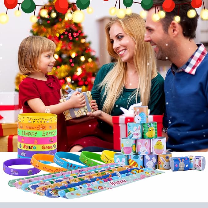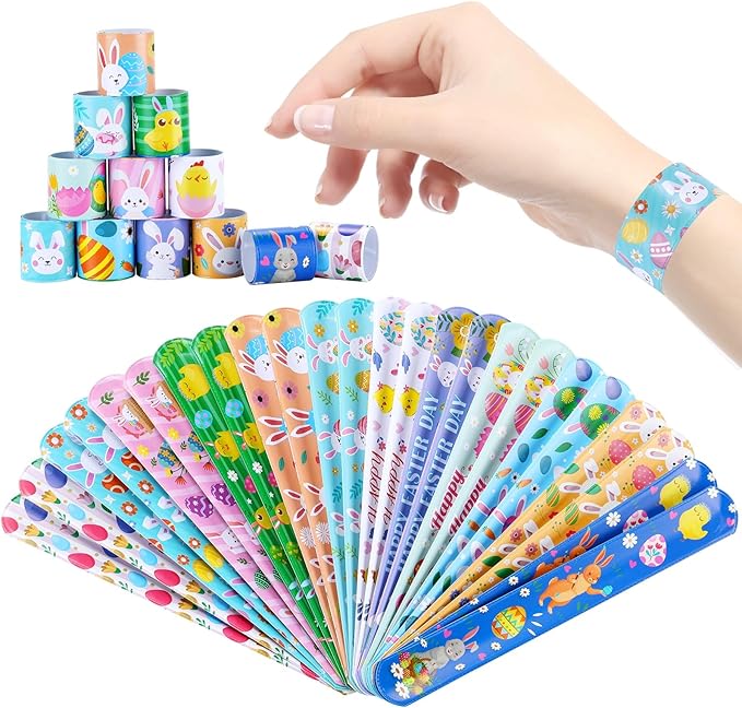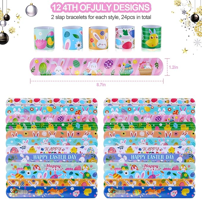 - Easter Toy Set:Includes 24 different designs of Easter slap bracelets, and 24 different designs of rubber wristbands with Easter elements such as Easter eggs, rabbits, carrots, etc。