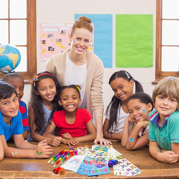 - Safe Material and Reliable Materials: the butterfly party goodie bags fillers have been strictly tested, made of quality materials, and safe with smooth surfaces; Tattoos can be easily removed with makeup remover,and our stacking buildable 12 colors crayons are made of paraffin and plastic,butterfly car and stamps are made of plastic, other stickers are made of paper, nontoxic, safe material, safe for children to use