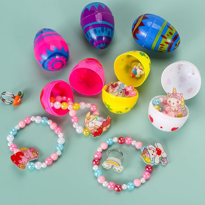 - š°Great value: Easter eggs with toys pack Includes 24 Easter eggs with the total of 24 unicorn bracelets and cute rings. Each colorful Easter Egg contains an adorable unicorn bracelet and rings. Easter egg stuffers is an amazing gift for Easter egg hunting games.