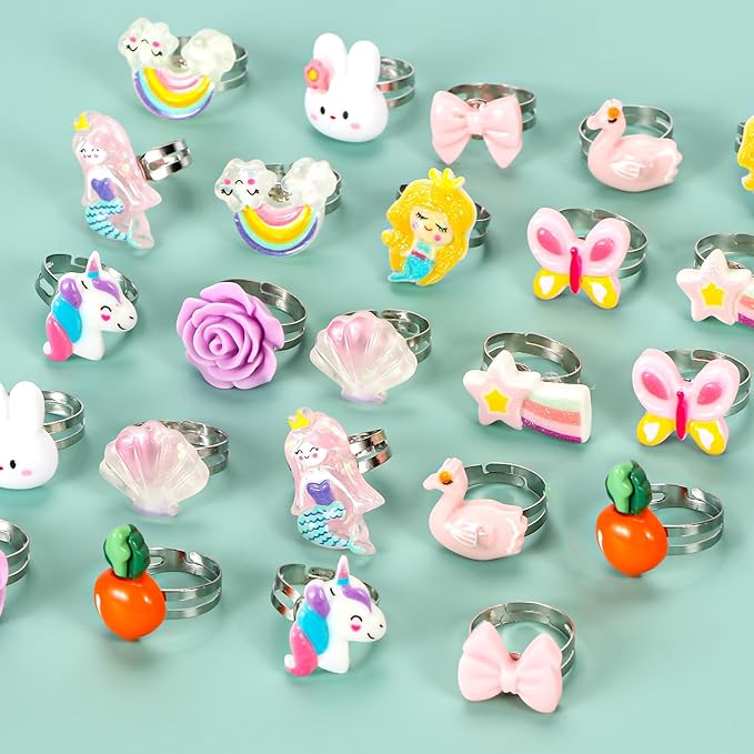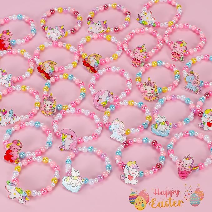 - š°Ideal Kids Easter Gifts: This girls jewelry set has wide applications, suitable for Easter party, Easter surprise eggs, birthday party, classroom exchange and prize supplies, unicorn favors or collections, etc. It will definitely make your children smile. It has an elastic rope inside to make it easy about you to use, a stretchable size suitable for most girls' age to wear. It is perfect for Easter egg hunt events and for collecting inside a basket.