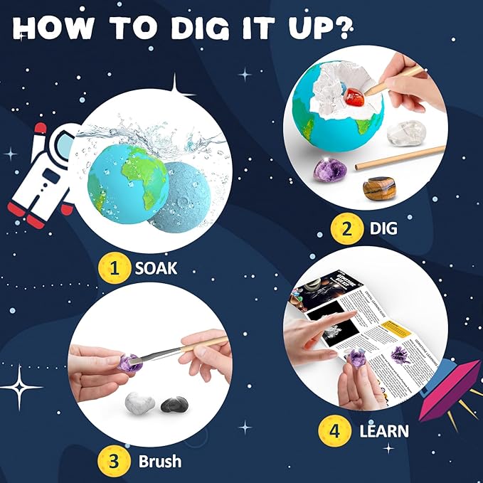 - 【Embark on a Cosmic Adventure】Gem Exploration Kit beckons young explorers (ages 3-12) on an enthralling journey through the cosmos. This immersive, hands-on experience not only captures their vivid imagination but also instills a deep-seated curiosity about the vastness of the universe. As they delve into the wonders of the solar system, learning becomes an exciting expedition, making complex scientific concepts accessible and enjoyable.