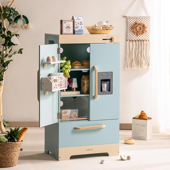 - CRAFTED DESIGN: ROBUD toy Fridge is crafted with meticulous care and boundless creativity. Every detail, from its cute look to its realistic features, has been carefully sculpted to evoke a sense of style and warmth for children during playtime.