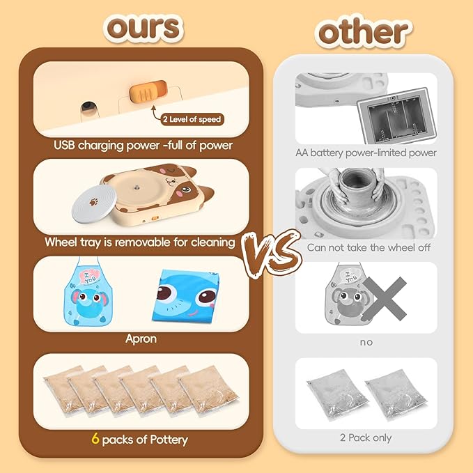 - 【EVERYTHING THEY NEED TO BEGIN THEIR ARTISTIC JOURNEY】With our pottery wheel kit for kids age 9-12, your child will receive a complete set of tools to kickstart their creative exploration. The set comprises of 1 pottery wheel kit, 6 air dry clays, 1 refillable spray bottle, 2 painting brushes, 2 painting kits, 1 painting tray, 1 transite cording, 1 USB charging cable, 1 non-slip sponge sticker, 1 gem sticker, 1 apron, and 2 clay knife & shaping tools.