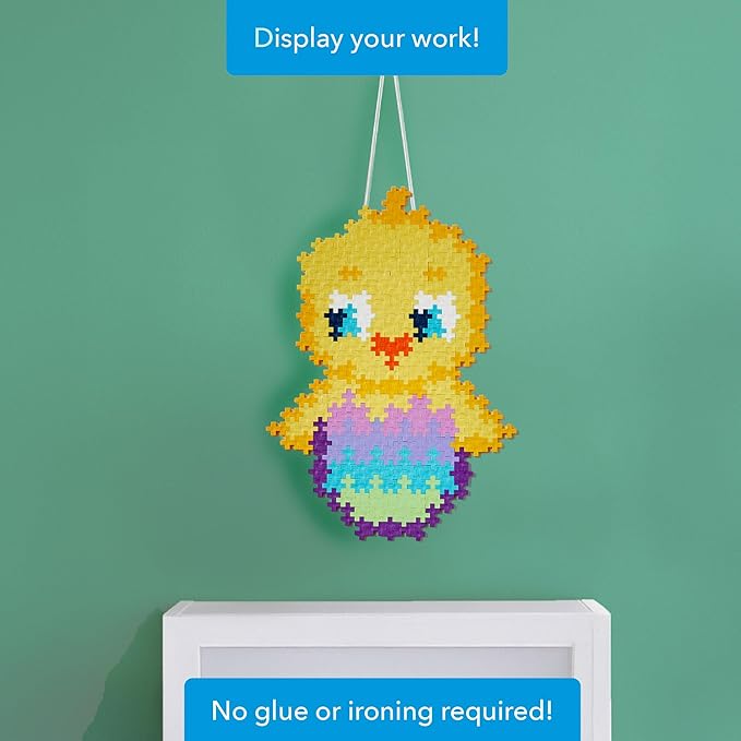 - Building Set Includes: This colorful Chick set includes 250 pieces and a numbered pattern flyer to build on. When you are done, display it on a table or hang it up as spring decor - no glue or ironing required! Each block piece measures 3/4" x 1/2".