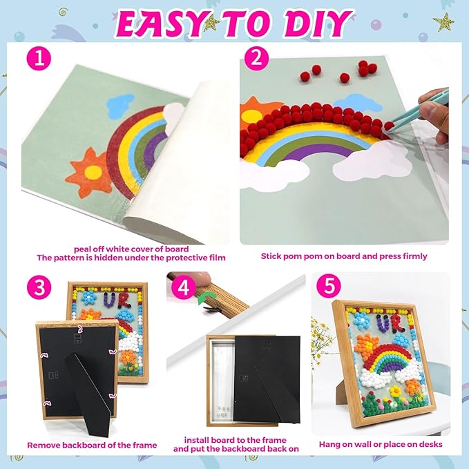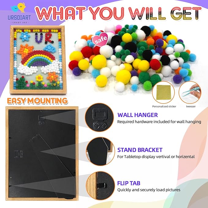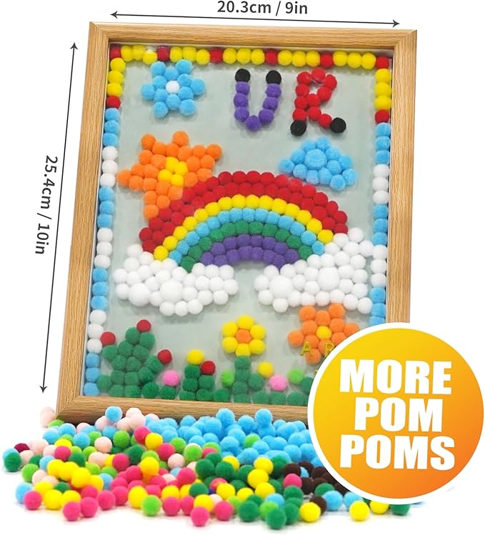 - What You Can Get: This URSDIART Rainbow Pom Pom craft kits includes a rainbow board with adhesive backing, over 650+ pom pom craft (0.3in), a 10 inch photo frame, a 3D sticker with numbers and letters, and tweezers. Provide more additional pompoms. you can follow the tutorial above or create according to your own ideas.