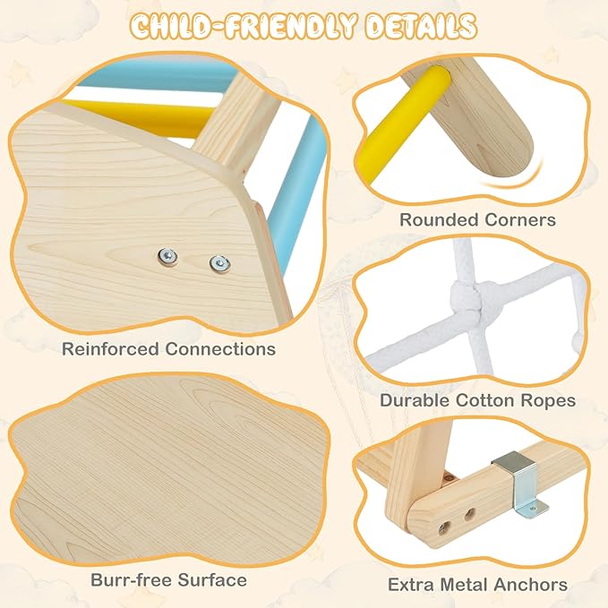 - 【Play Safer with 100% Natural Materials!】The wooden indoor jungle gym uses 100% natural industrial grade wood as materials as the slide boards are made of birch wood while the round rods are made of beech wood, both of which are characterized by great durability. The surface is coated with a Non-toxic BPA free which is more environmentally friendly than plastic materials, thus creating a safe environment for your kids when playing. NOTE: Parents must supervise children while playing.