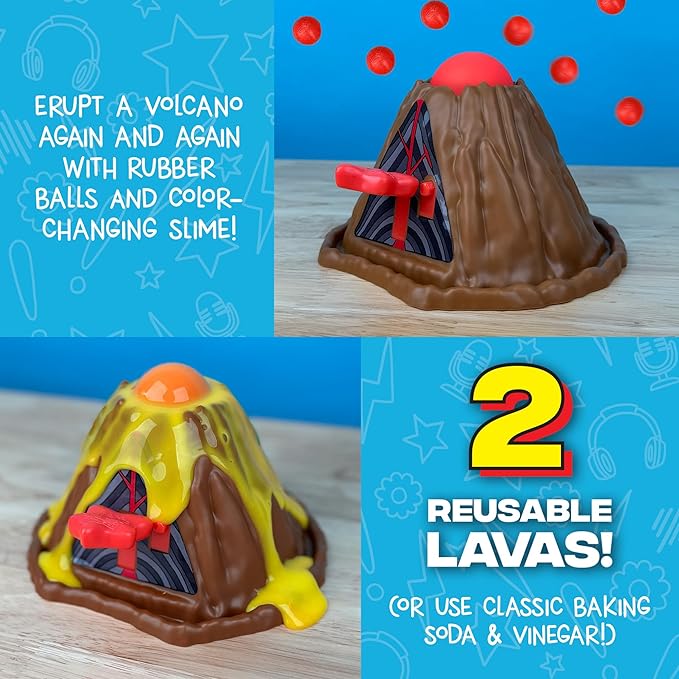 - ERUPT YOUR OWN VOLCANO AGAIN & AGAIN (3 TYPES OF ERUPTIONS!) - This fun new twist on a classic science experiment works with three different types of eruptions (a color-changing slime eruption, a soft rubber balls eruption, and the tried-and-true vinegar-and-baking-soda eruption) for maximum replayability! (Slime and rubber balls included; baking soda and vinegar sold separately)