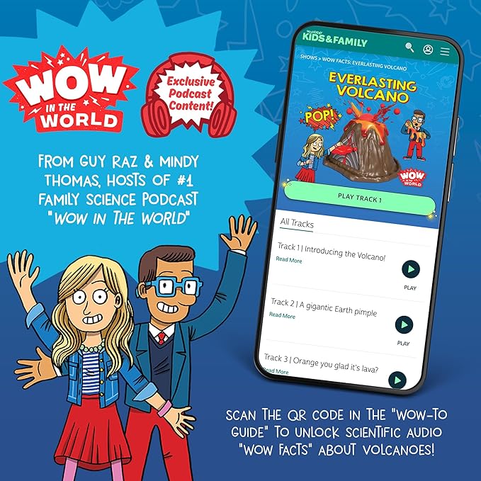 - EXCLUSIVE AUDIO CONTENT - Wondery Kids and the #1 family science podcast “Wow in the World” hosts Guy Raz & Mindy Thomas bring you & your family on a bonkerballs journey through the science behind volcanoes! Audio “Wow Facts” await you, accessible only within the pages of the “Wow-To Guide!”