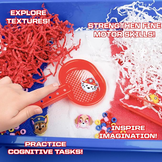- READY-TO-USE SENSORY BIN: This all-in-one set comes packed with materials for instant sensory fun, including crinkle paper, play sands, pony beads, tongs, a sifter, and squishy charms of Paw Patrol Chase, Marshall, Skye, and Rubble!