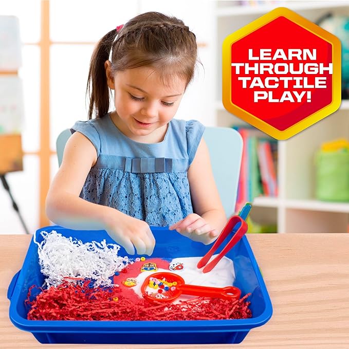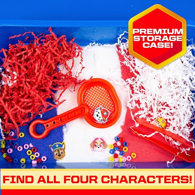 - SET INCLUDES: 60 Colorful Pony Beads, 1 Sheet of Crinkle Paper, 1 Sensory & Storage Bin (14.5 in. x 9.75 in. x 3.25 in.), 1 Pair of Tongs, 1 Sand Sifter, 4 Rubber Charms (Chase, Marshall, Skye, Rubble), 3 Bags of Play Sand (Blue, Red, White, 7 oz. Each), Play Guide