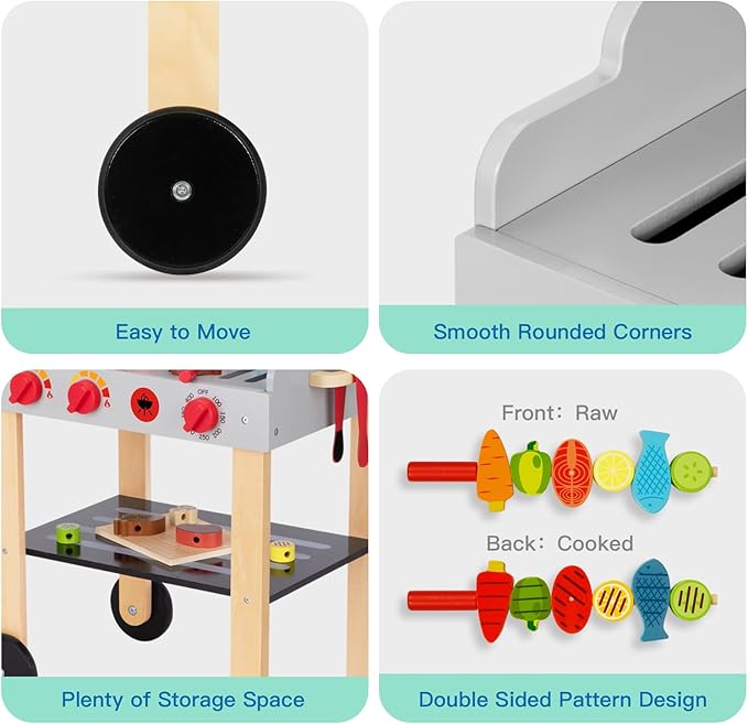 • BARBECUE FUN: Your child will enjoy using shelves to pick up various foods and then skewering them on wooden sticks for barbecue. Turning the switch will make a clicking sound, adding to the realism of grilling games
