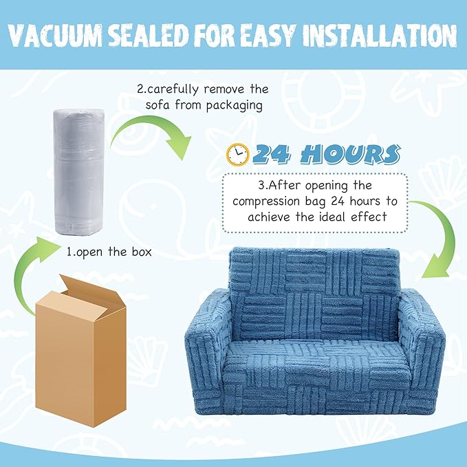 - 【No Installation Required】: The kids fold out couch comes in vacuum packing. Simply take it out and plump it up for 24 hours. Allowing 24 hours is best for the toddler chair to reach its full size.