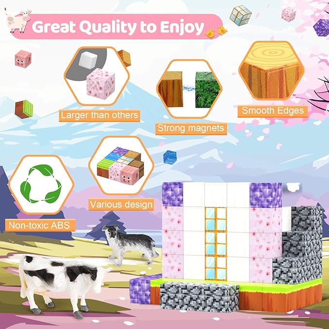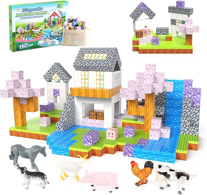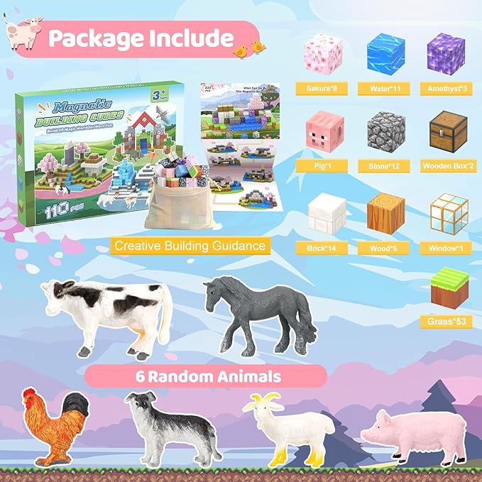 • CHERRY THEME: Step into the magical world of animal and cherry with our Magnetic Blocks set! This 110-piece set features vibrant magnetic blocks with 6 adorable animals, sparking endless creativity and fun for kids.