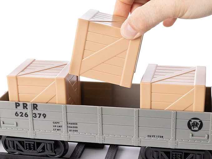 - FEATURES: Battery-powered Locomotive / Working headlight / Engine cab light / Water-Vapor Smoke Effects / Removable crate load in Gondola / Fixed knuckle couplers / Authentic train sounds including announcements, bell, and whistle
