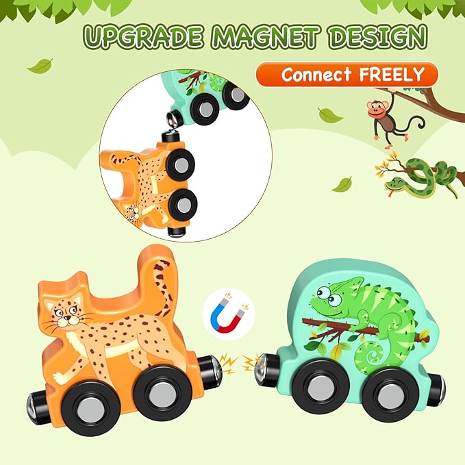 - 🚂🐻【Magnetic Animal train set】Our magnetic wooden train set is the PERFECT CHOICE for you and your toddlers as it is made from natural wood, double-sided printed with well designed. This montessori toys is suitable for toddlers and represents the perfect activity to learn through play!