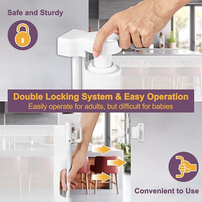 - Double Locking System: Our tall dog gates feature a double locking system that enhances security and prevents accidental opening by babies, while allowing adults to open them effortlessly with one hand.
