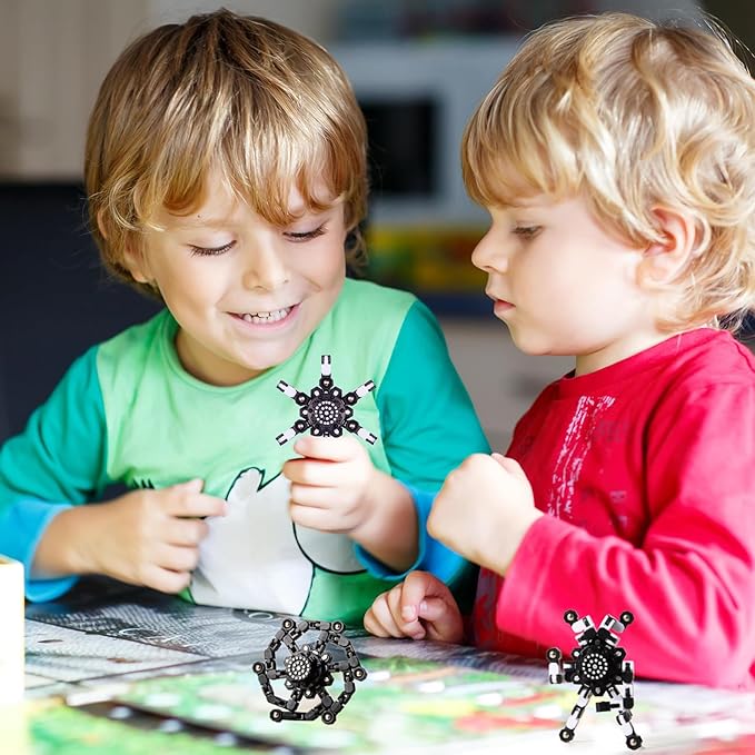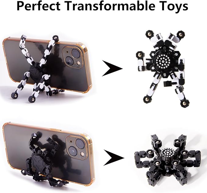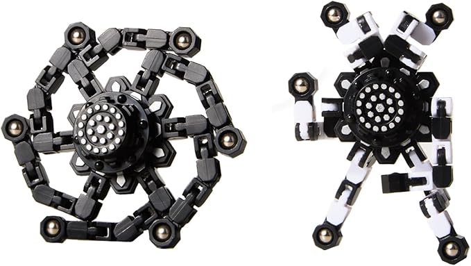 - 【Transformable Finger Gyros】2 colors (black white ) finger spinners included. Each fidget spinner has six deformable chains. Each of the links can pivot and lock into 5 positions, you can create any shapes you want, such as various shapes of spinners, robots and even mobile phone holders. It can also exercise your kid’s hands-on ability, hand-eye coordination and logical thinking ability by changing the shape of the toys